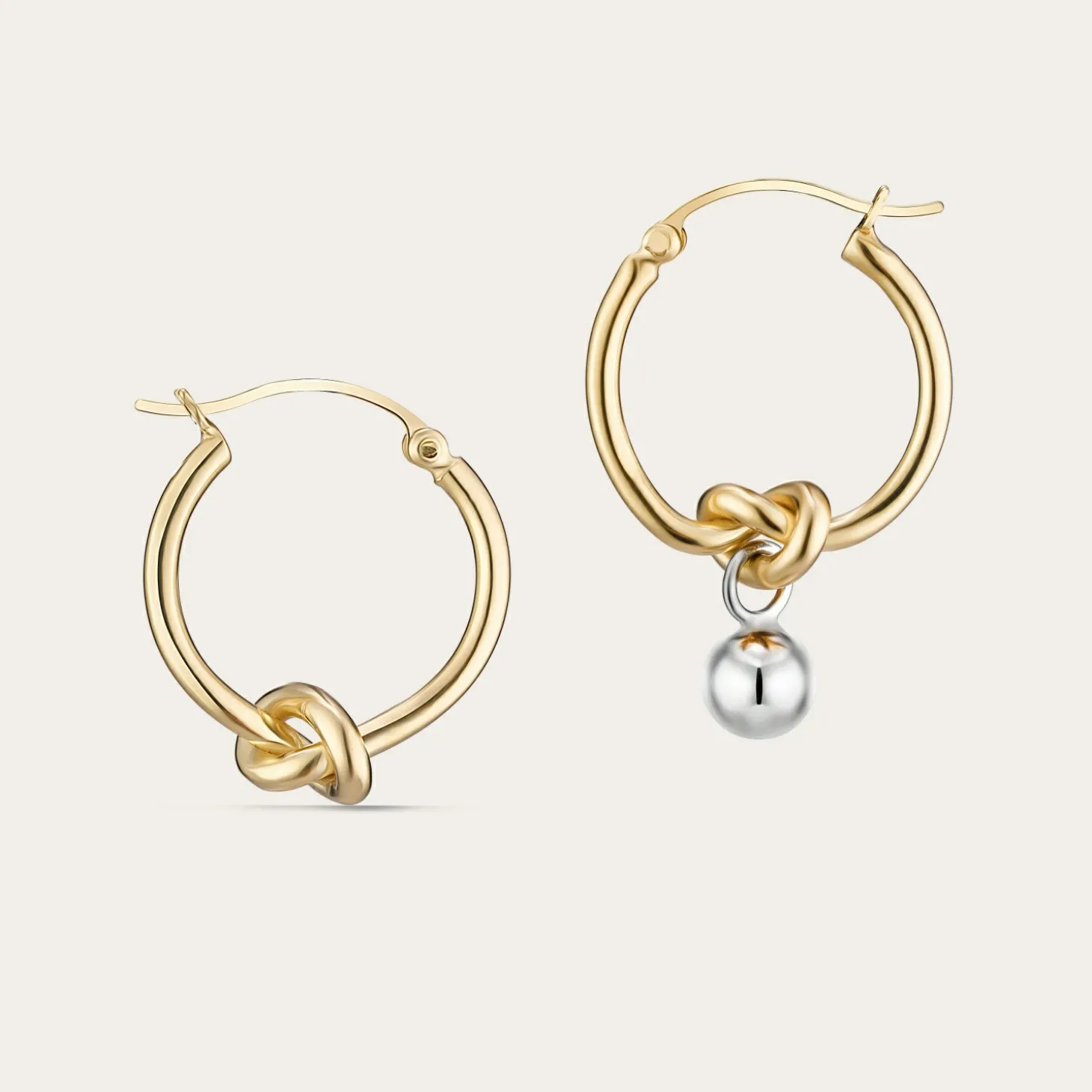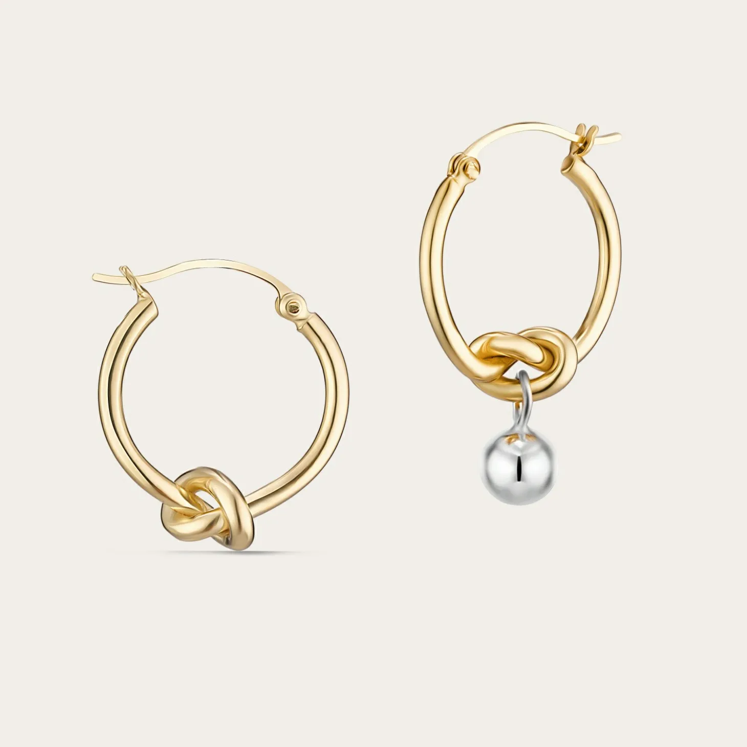 Klasyczne Okrągłe Kolczyki Z Motywem Supła I Asymetrycznie Zawieszoną Kulą Na Jednym Z Nich. Nadają Się Zarówno Na Co Dzień, Jak I Na Specjalne Okazje. Klasykę Przełamuje Zabawa, Elegancja Nabiera Dystansu. Lekkie I Wygodne. Zobaczysz, Nie Będziesz Chciała Się Z Nimi Rozstawać!